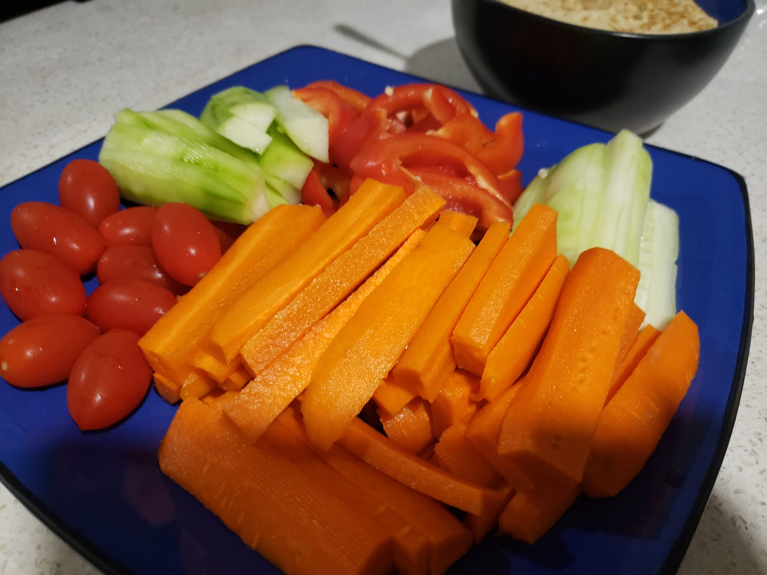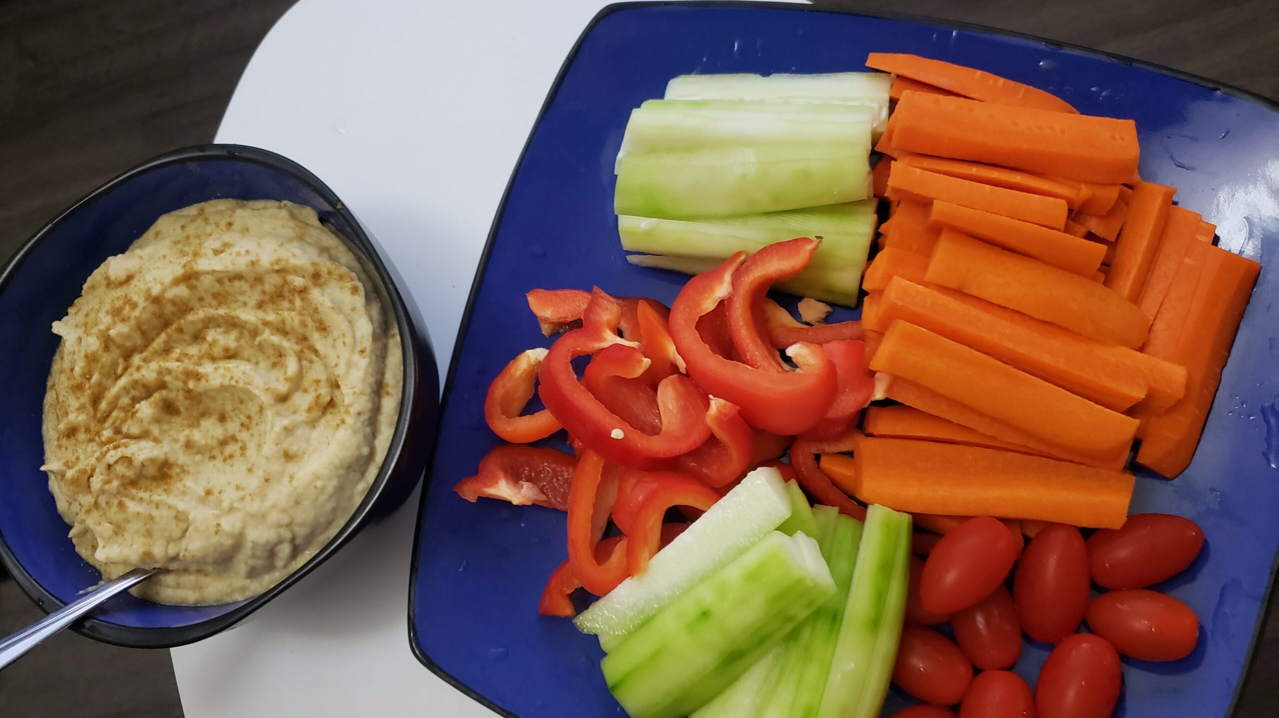 Bạn sẽ có một hỗn hợp đặc quánh. Người ta gọi nó là “hummus dip” khi ăn chung với rau củ sống, đặc biệt là cà rốt, cà chua bi, hoặc thân cần tây sống rất được ưa chuộng. Nếu bạn thích bạn có thể ăn kèm “crackers” lạt hoặc ăn với các loại bánh mì đều được, tuy nhiên, nếu như vậy lượng carb sẽ quá nhiều và khiến bạn tăng cân. Vì vốn dĩ hummus dù có nhiều đạm cũng đã có nhiều carbs lắm rồi, ở dưới hình này là ảnh chụp khi tôi thường ăn cà rốt và cà chua bi chấm hummus ăn tối, khi ăn nhiều hummus sẽ có cảm giác nặng bụng nên tôi hay kèm ăn dưa leo và ớt chuông không để cân bằng. Như vậy, có thể nói bữa tối này có thể phù hợp cho những ai muốn giảm cân nữa đấy.